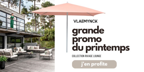 Du 1er au 30 avril profitez de notre offre incroyable : pour l'achat des produits de la gamme RIVAGE Lounge de Vlaemynck pour une somme de 4000€ minimum, un parasol PAXI (2x2 m ou Ø 3m) et son socle correspondant, vous sont offerts ! Soit une économie entre 700 et 1000€ selon le modèle !