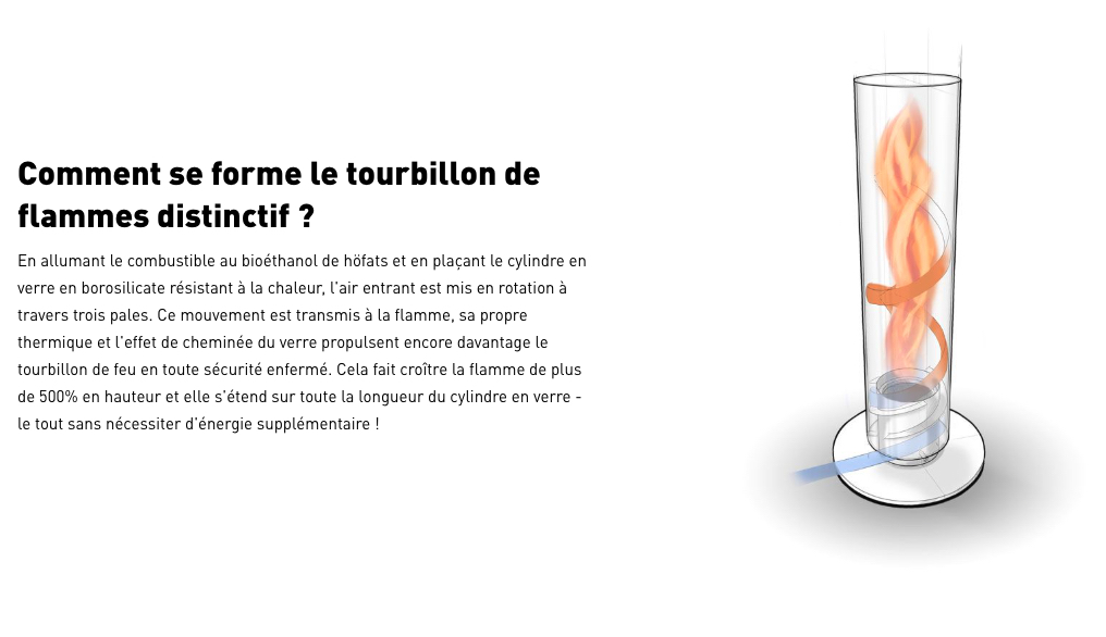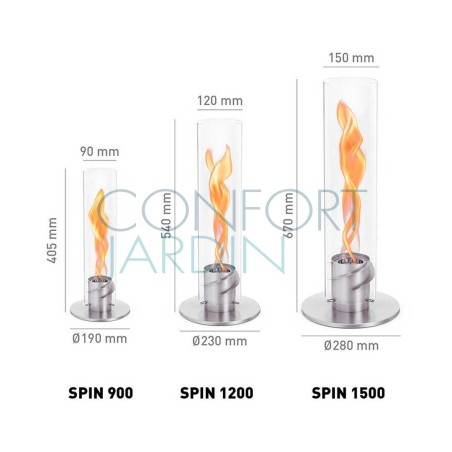 Le cœur de l'innovation du SPIN 900 réside dans son système rotatif breveté qui transforme la flamme en un fascinant tourbillon de feu. Grâce à une rotation ingénieuse autour de son axe vertical, le SPIN crée un effet visuel spectaculaire : les flammes s'étirent et dansent en spirale hypnotique, montant jusqu'à 50 cm de hauteur. Ce phénomène, aussi captivant que relaxant, devient instantanément le point focal de toute réunion en plein air.