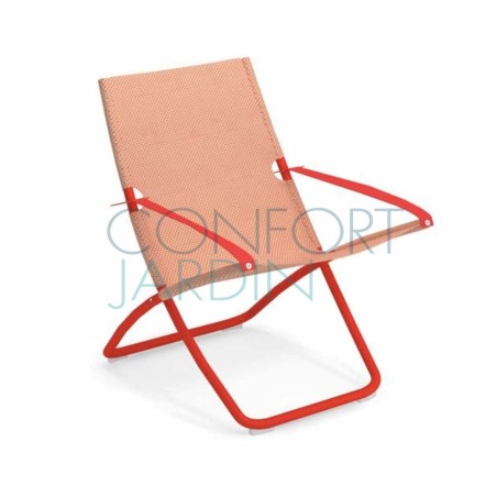 Chaise longue SNOOZE de la marque EMU. Structure en tube d'acier verni Rouge écarlate, revêtement en tissu technique Emu-Tex couleur Pêche. Légère, pliable et inclinable en deux positions : lecture ou repos. Disponible en 10 combinaisons de coloris.