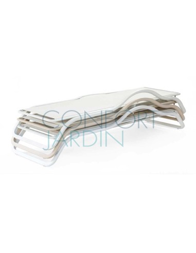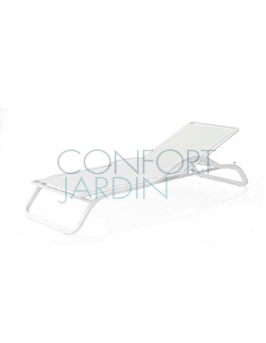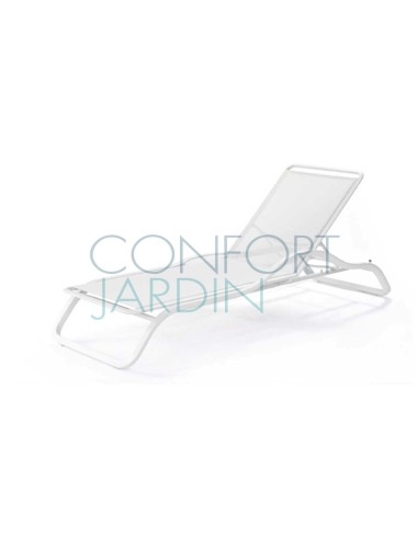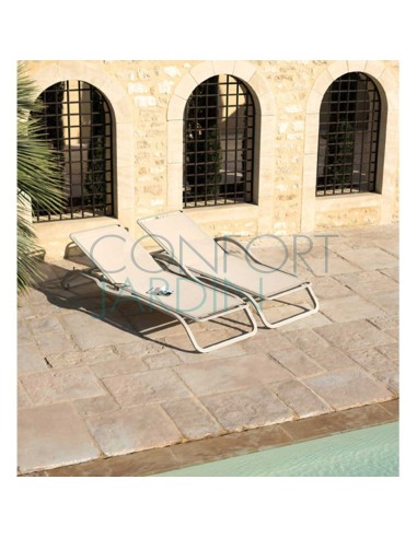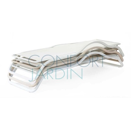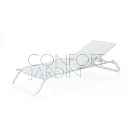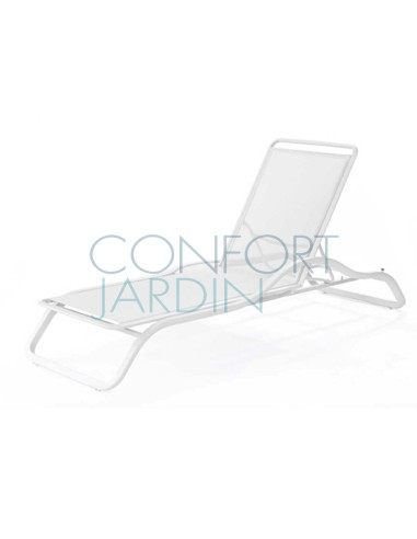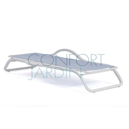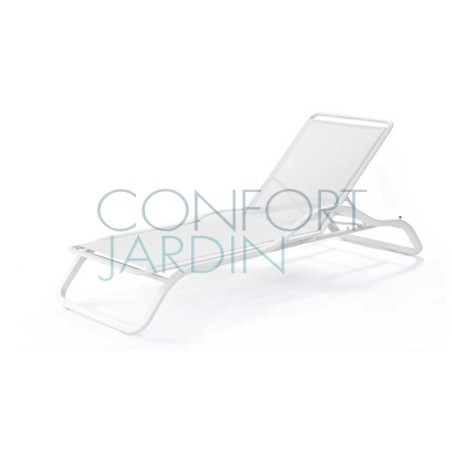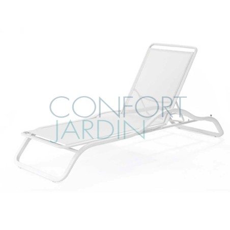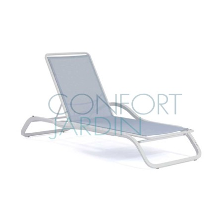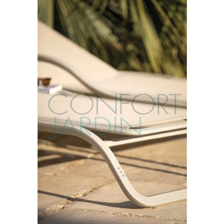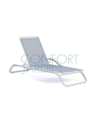 Bain de soleil avec accoudoir et tablette MARUMI de la marque EGO Paris. Structure en aluminium thermo-laqué. Toile en Batyline® - plusieurs coloris disponibles. Dossier inclinable (4 positions). Empilable.