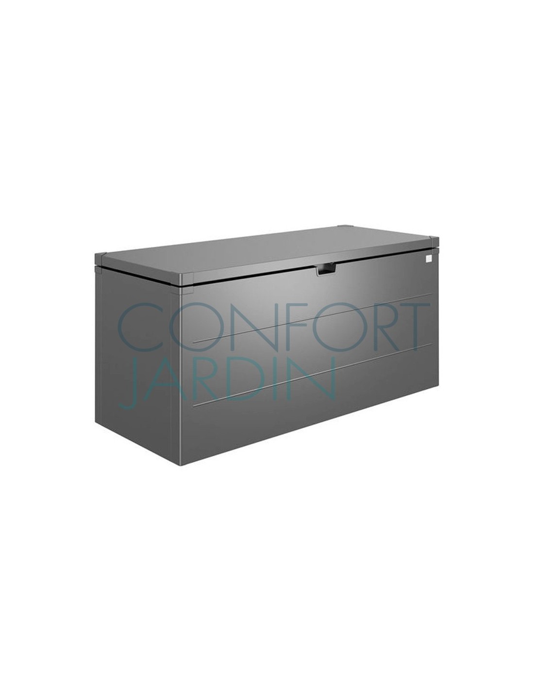 Coffre de rangement extérieur pour les jardins et les terrasses StyleBox de chez BIOHORT. 170 x 70 x 81 cm Volume environs 685 L. Parois en acier galvanisé à chaud et thermolaqué. Ne nécessite aucun entretien. Étanche à l’eau de pluie.