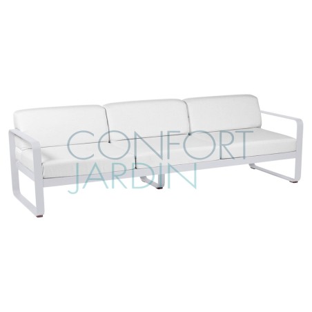 Canapé droit 3 places BELLEVIE couleur blanc grisé de la marque Fermob. Structure en aluminium laqué - Coussins : revêtement en tissu acrylique fil teint masse, amovibles et déhoussables. Disponible en 23 coloris de structure.