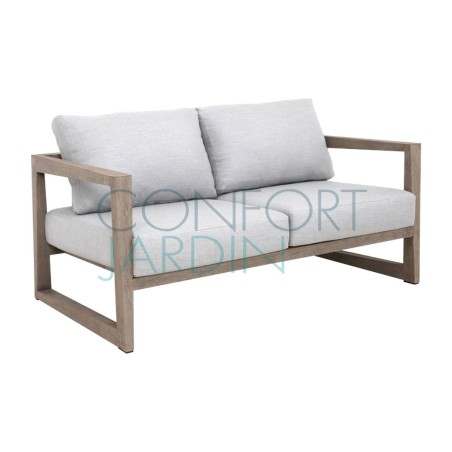 Canapé 2 places SKAAL Small de la marque Les JARDINS, 140 x 72 cm. Structure en teck Duratek et coussins Sumbrella gris clair.