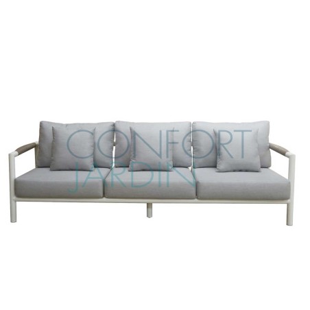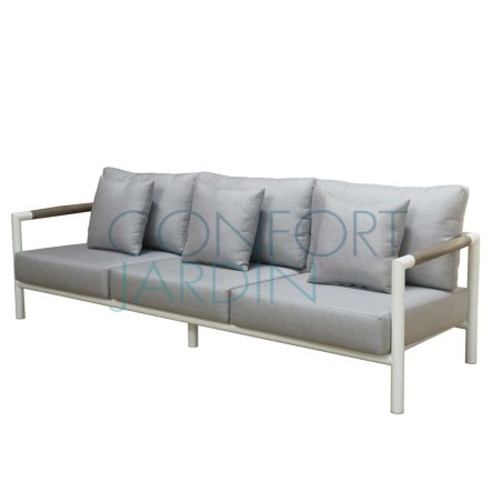 Canapé 3 places BASTINGAGE en aluminum blanc, insert en Duratek et coussins Ateja gris clair.