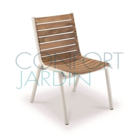 Fauteuil empilable avec structure tubulaire en aluminium blanc. Accoudoirs finition teck naturel. Habillage : lattes aluminium blanc laqué. Le fauteuil repas Pilotis, vendu par 2, bénéficie d'une livraison gratuite. Délais de livraison : 4-5 semaines