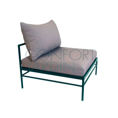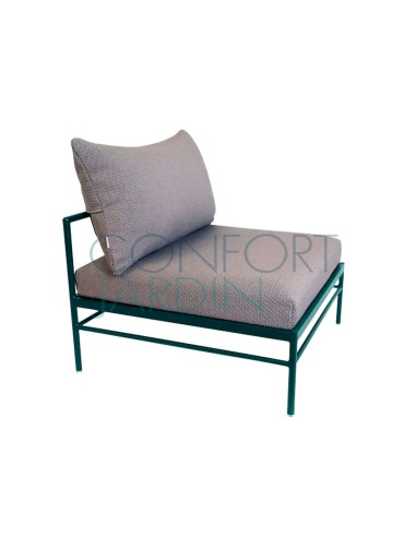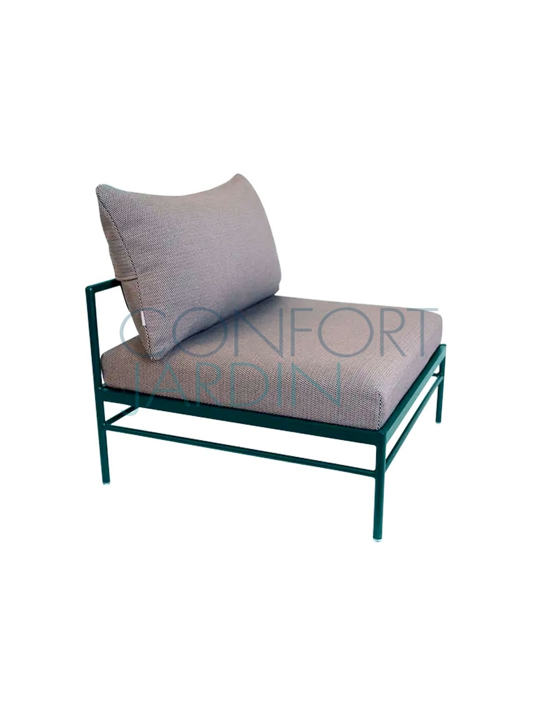 Chauffeuse Rivage de Vlaemynck. Structure en aluminium laqué couleur séquoia. Coussinages en en mousse polyuréthane HR 30 kg/m3. Habillage en toile de la collection Textures (3 coloris)