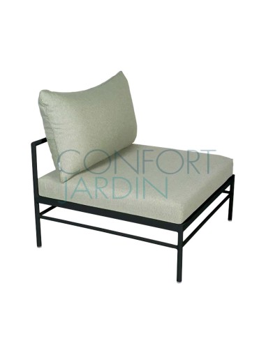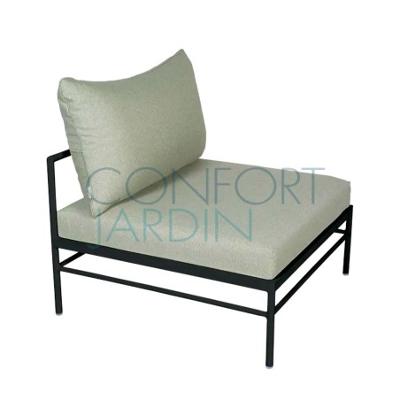 Chauffeuse Rivage de Vlaemynck. Structure en aluminium laqué couleur basalte. Coussinages en en mousse polyuréthane HR 30 kg/m3. Habillage en toile de la collection Mix (2 coloris)