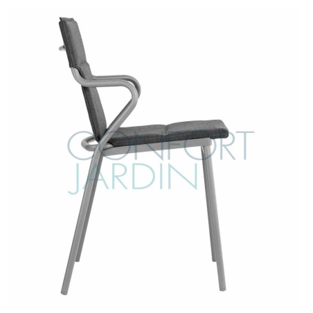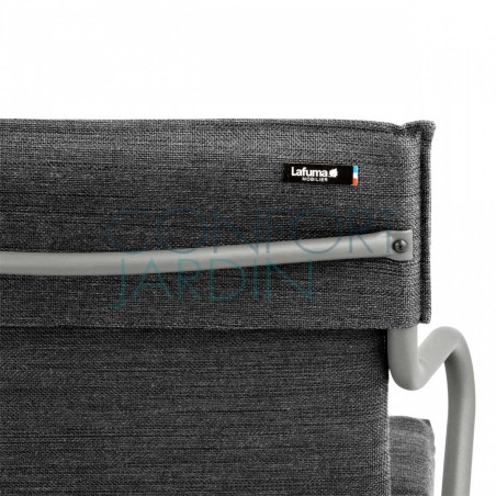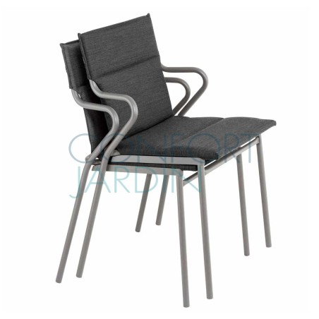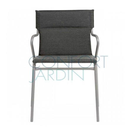 Fauteuil empilable Ancône de la marque LAFUMA - couleur Onyx. Structure en acier galvanisé couleur Titane. Matelas technique Hedona « trois épaisseurs » pour l'usage intérieur / extérieur. Accoudoirs.