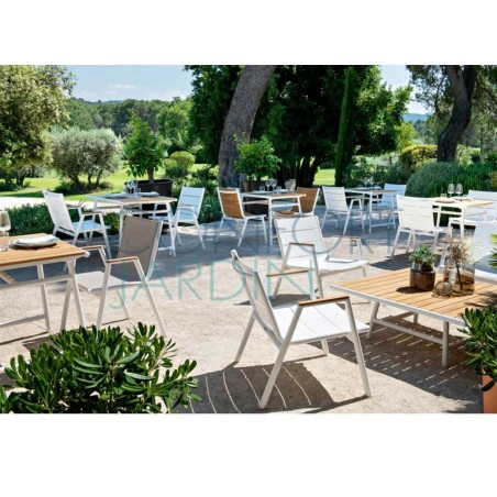 Fauteuil repas Pilotis de la marque Vlaemynck. Empilable avec structure tubulaire en aluminium blanc. Accoudoirs en teck huilé. Habillage toile Batyline® Iso. Plusieurs coloris. Design Alberto Basaglia et Natalia Rota Nodari.Le fauteuil repas Pilotis, vendu par 2, bénéficie d'une livraison gratuite.Délais de livraison : 4-5 semaines