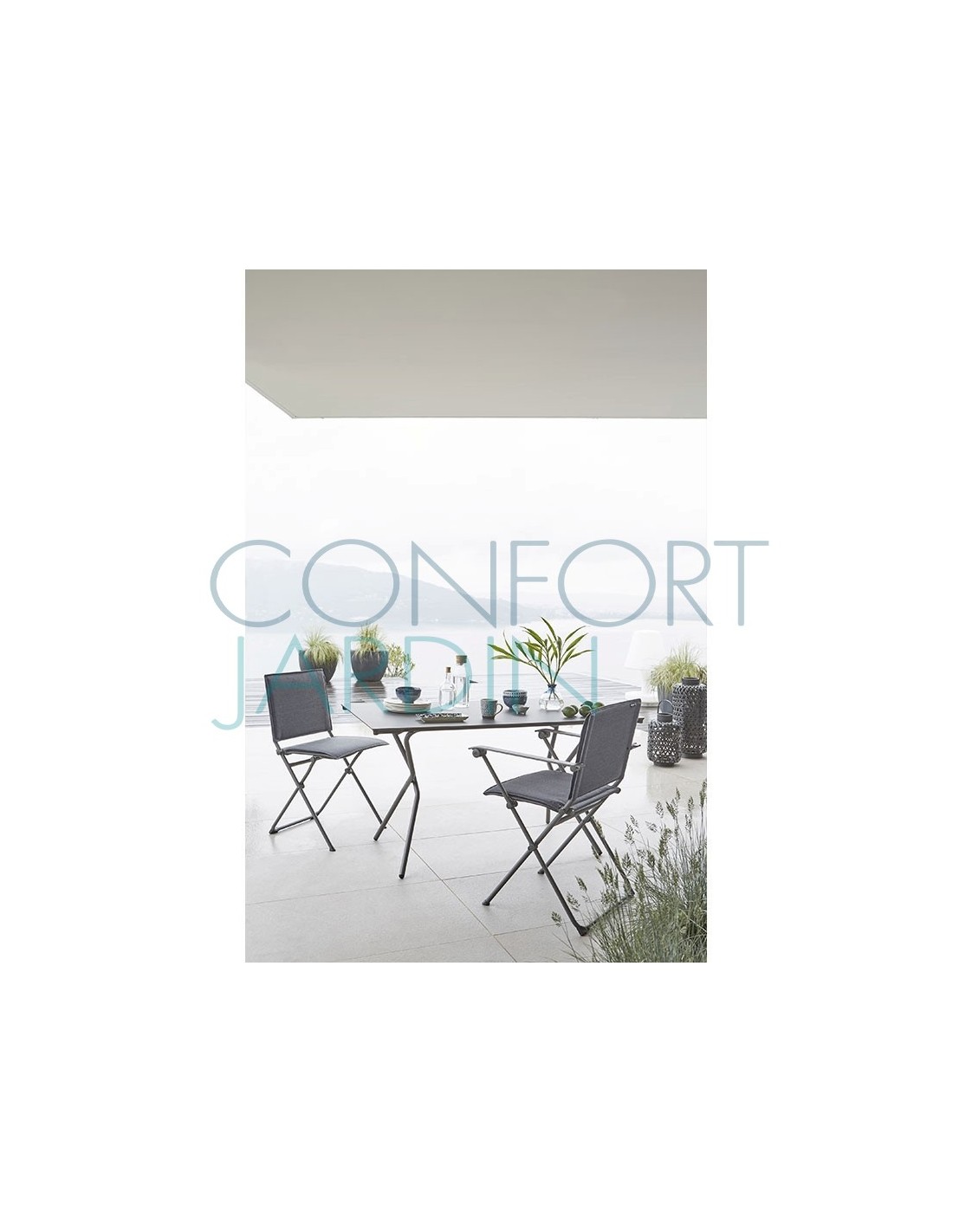 Ses atouts : - Sa toile Batyline® est conçue spécialement pour le mobilier d’extérieur. La belle régularité de son tissage 2 fils - 1 fil lui permet de conjuguer profondeur, subtilité des effets et des couleurs. Le fil Batyline® est traité pour résister à l'humidité et au développement des micro-organismes. Il est léger, durable et d’un entretien aisé. Il déjoue les UV et sèche rapidement. Labellisé Oeko-Tex®, il est garanti sans substance toxique pour l'homme et l'environnement. - Sa structure solide en acier galvanisé défie la corrosion. - Ses finitions sont de haute qualité avec ses pièces plastiques de rotation conçues pour résister aux frottements, ses coutures renforcées et ses patins de pieds grande stabilité. - Son pliage simple et son faible encombrement permettent un rangement facile. - Sa belle couleur sobre et son piètement noir sont coordonnables avec les tables Anytime stone.