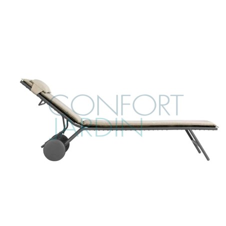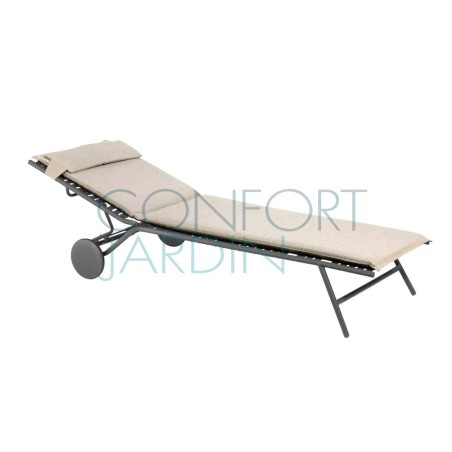 Bain de soleil BAYANNE de la marque LAFUMA - couleur Latte. Structure en tube d'acier galvanisé couleur Titane. Dossier réglable en inclinaison trois positions dont une totalement allongée. Coussinage Hedona : réspirant et perméable. Sèche rapidement. Excellente tenue aux UV. 2 roues.