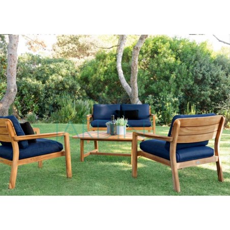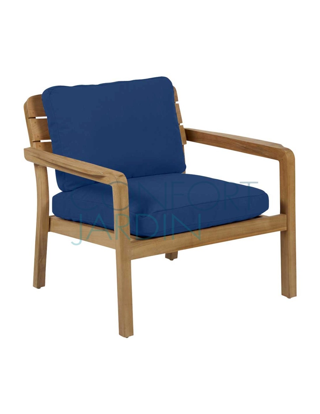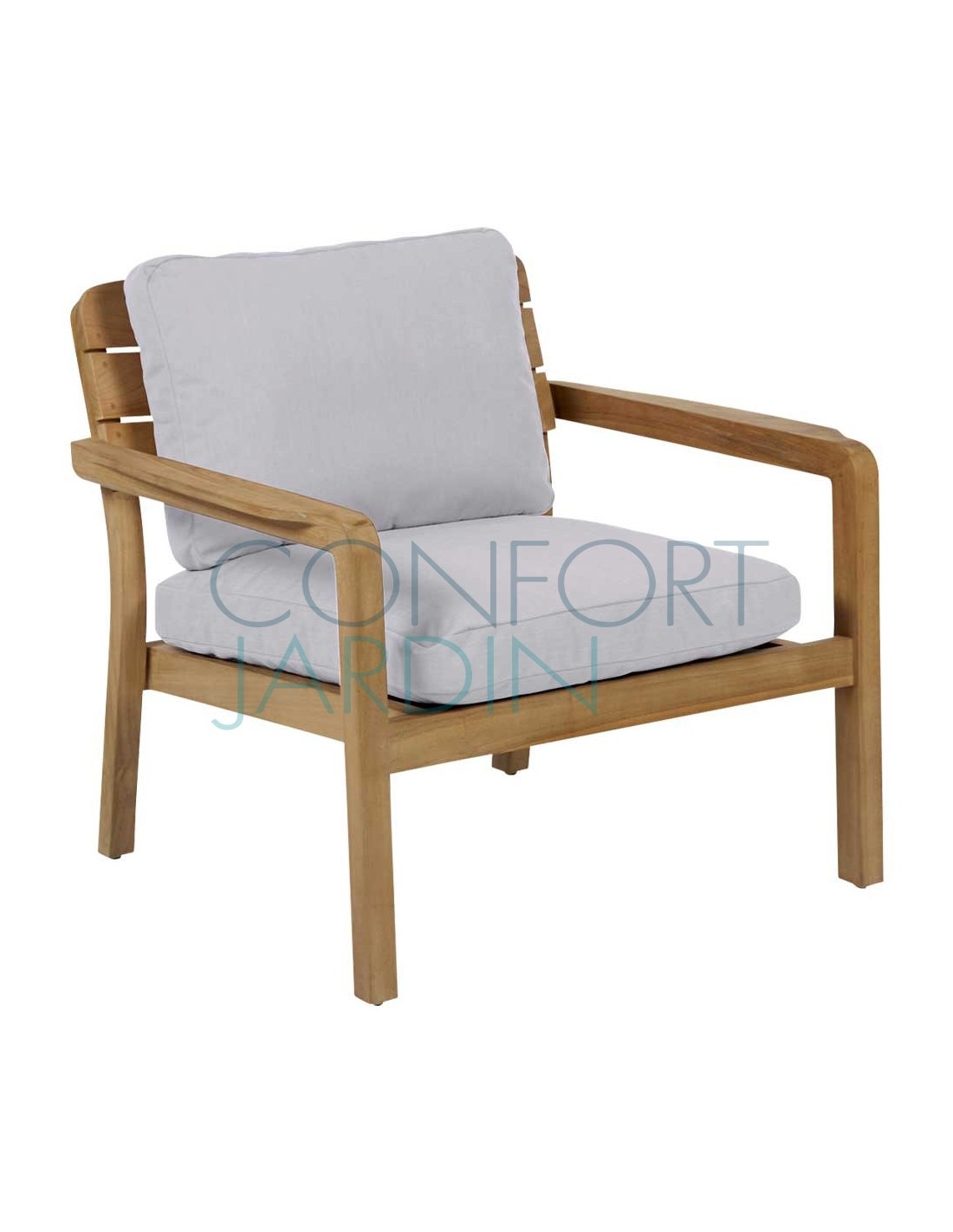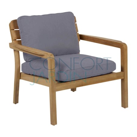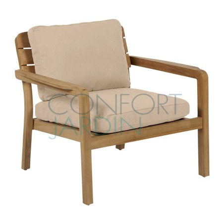 Fauteuil bas Lodge en teck finition naturelle. Coussins Batyline Eden.