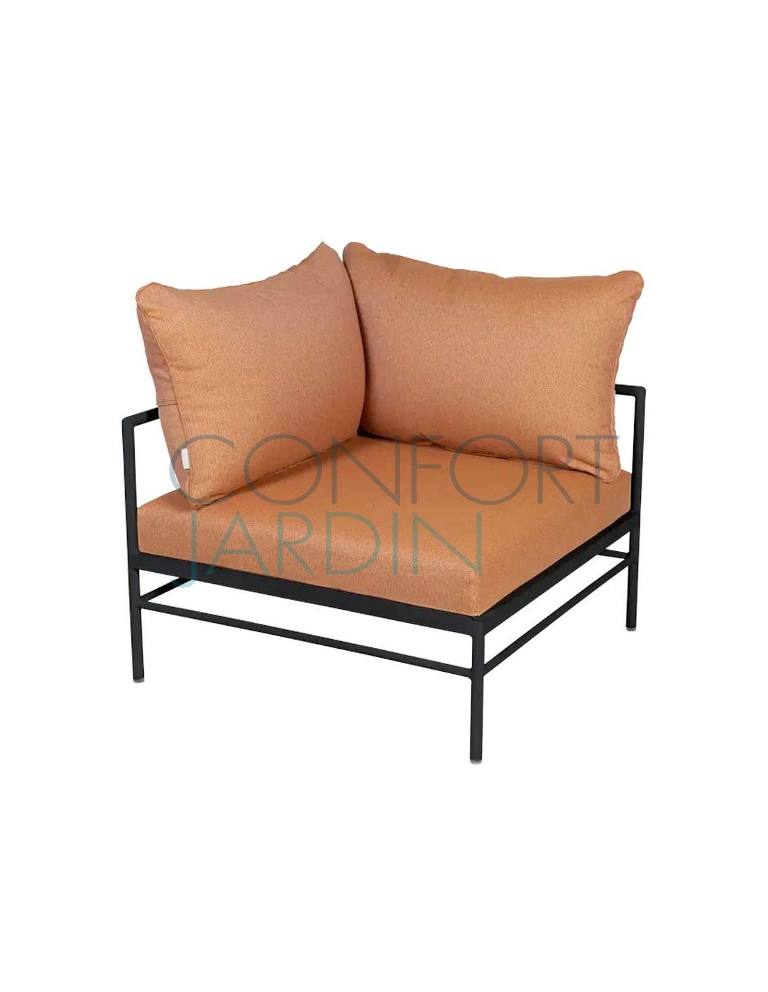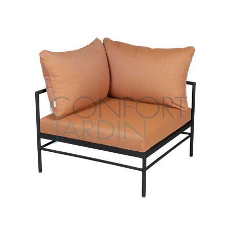 Fauteuil d'angle Rivage de Vlaemynck. Structure en aluminium laqué couleur basalte. Coussinages en mousse polyuréthane HR 30 kg/m3. Habillage en toile de la collection Mix (2 coloris).