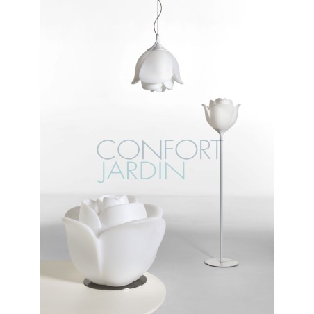 La ligne stylisée d'une rose pour une fascinante source de lumière... Cette fleur surdimensionnée (Hauteur 155 cm) est idéale pour créer une déco pleine de fantaisie dans son jardin ou son salon. Le lampadaire Baby Love est une véritable sculpture poétique sublimée par une lumière sensuelle. L'éclairage doux crée une ambiance lounge très tendance.