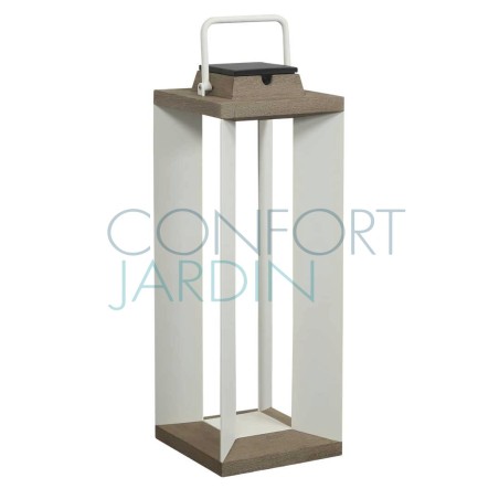 Lanterne d'extérieur LED rechargeable & solaire de la collection Teckalu de la marque Les JARDINS. Grand format - hauteur de 65 cm. En aluminium blanc et bois Duratek®. Rechargeable par le soleil ou par USB. Avec poignée. Module solaire LED avec 3 modes de fonctionnement.