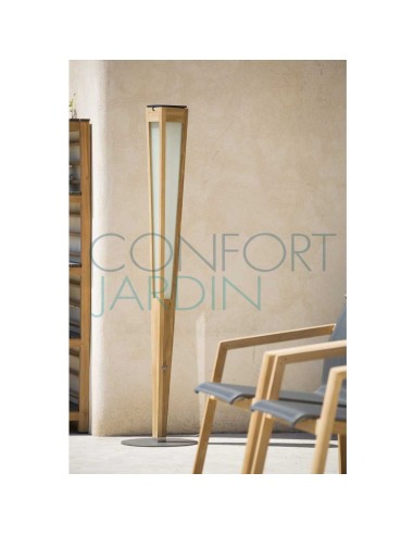 Torche d'extérieur LED rechargeable & solaire de la collection Tinka Tecka de la marque Les JARDINS. Grand format - hauteur de 120 cm. Structure en bois agrémentée de parois diffusantes en polycarbonate opalin, l'ensemble est équipé d'une base ronde en ardoise. Couleur teck naturel.