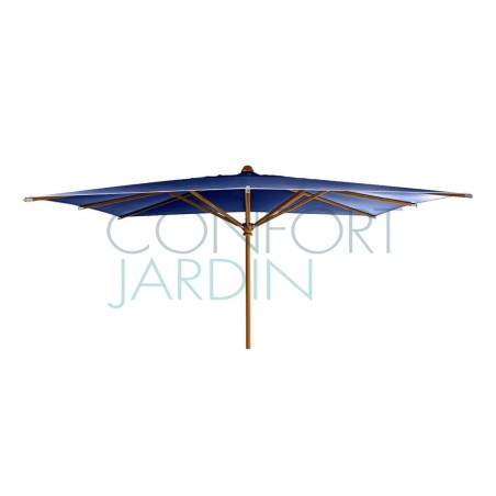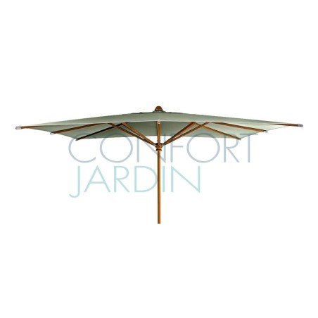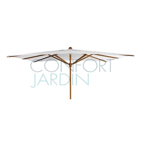 Parasol en bois KOTO de la marque Vlaemynck. Dimensions: 400 x 300 cm. Structure mât et baleines en bois de Koto, vernis couleur Frêne. Mât fixe ø 45 mm. Baleines Koto (4). Manœuvre par poulie. Finition tresse blanche. Étui de protection.
