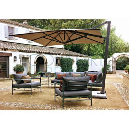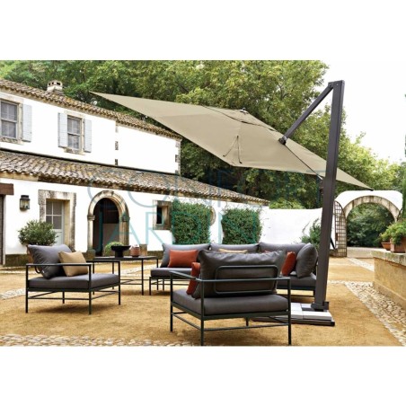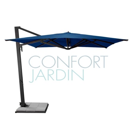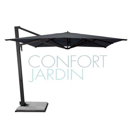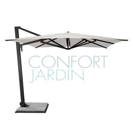 Parasol Borée 300 x 300 cm de Vlaemynck. Mât déporté 360° (twister intégré). Structure en aluminium laqué couleur anthracite. 8 baleines en aluminium laqué. Ouverture par manivelle - 5 positions d'inclinaison avant/arrière. Toile teint masse - 16 coloris.