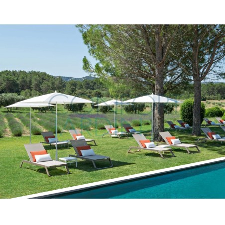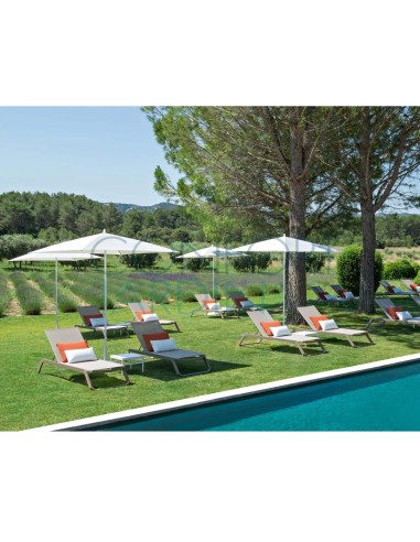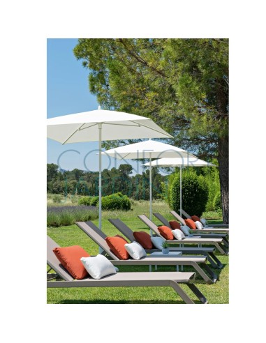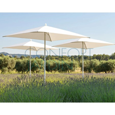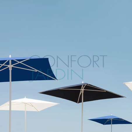 Le Parasol Paxi de chez Vlaemynck est un parasol à mât central solide, de qualité tout en étant léger. Le mât et les baleines sont réalisés en aluminium laqué blanc tandis que sa toile teint masse offre un large choix de coloris.