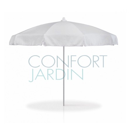 Parasol en aluminium avec bavolet ø250 cm de la marque VLAEMYNCK.  Mât inclinable aluminium laqué blanc ø 28 mm, ép. 1,4 mm. Baleines fibre de verre (10) ø 7 mm. Pique ø 32 mm, aluminium laqué blanc, avec vis de serrage. Finition avec bavolet et tresse coloris blanc.