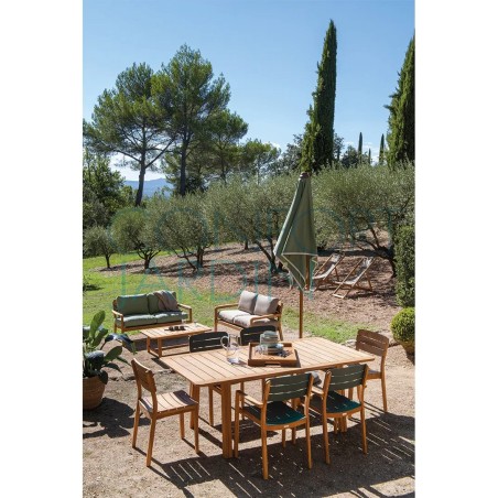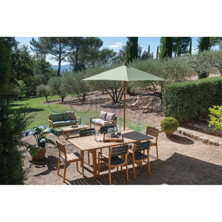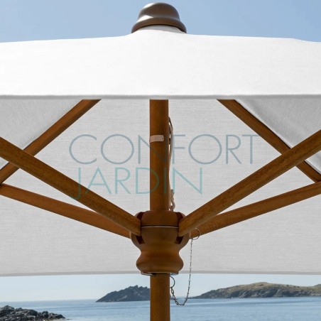 Parasol en bois KOTO de la marque Vlaemynck. Dimensions : 250 x 250 cm. Structure, mât et baleines en bois de Koto, vernis couleur Frêne. Mât fixe ø 45 mm. Baleines Koto (4). Manœuvre par poulie. Finition tresse blanche. Étui de protection.