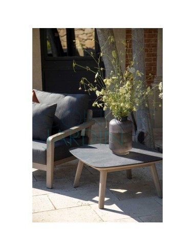 Table basse carrée COPENHAGUE de la marque Les JARDINS. 80 x 80 cm. Structure en teck Duratek et plateau en HPL finition ardoise.