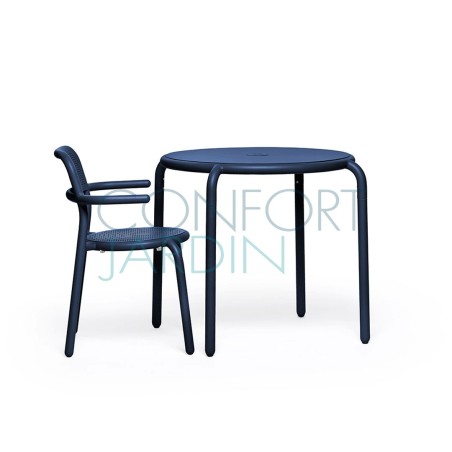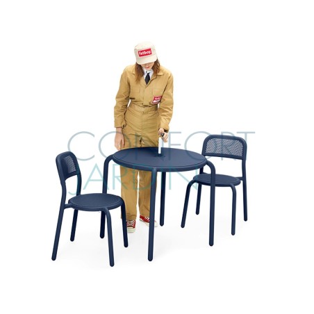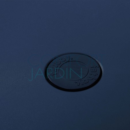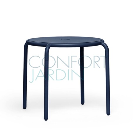 La table Toní est fabriqué en aluminium avec un revêtement haute résistance aux UV, aux intempéries et aux tâches. Elle possède un trou (refermable avec un bouchon assorti) pour parasol.