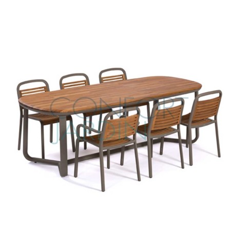 Structure en aluminium thermo-laqué avec laque semi-gloss (brillante) ou texturée selon finitions. Plateau en teck. Sobre et élégante, dessinée par Thomas Sauvage, cette table de repas vient compléter la superbe collection Marumi, pour aménager un espace de repas extérieur avec modernité et confort.
